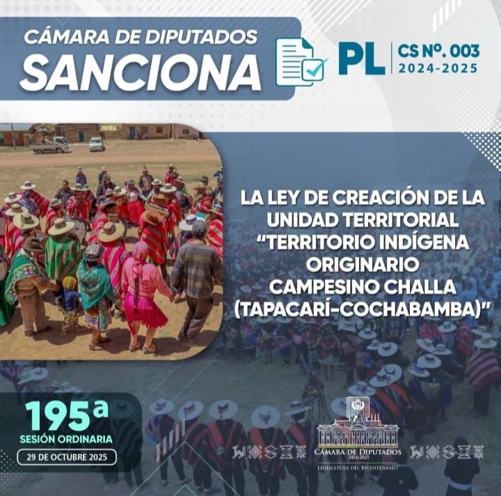 Tras más de 10 años de persistencia, el territorio indígena originario de Challa, perteneciente a la nación Soras, de Cochabamba, logró finalmente la aprobación de su autonomía indígena originaria campesina. La madruga de este jueves, la Cámara de Diputados sancionó la Ley de Creación de la Unidad Territorial Indígena Originario Campesino Challa, que ahora pasa al Ejecutivo para su promulgación.