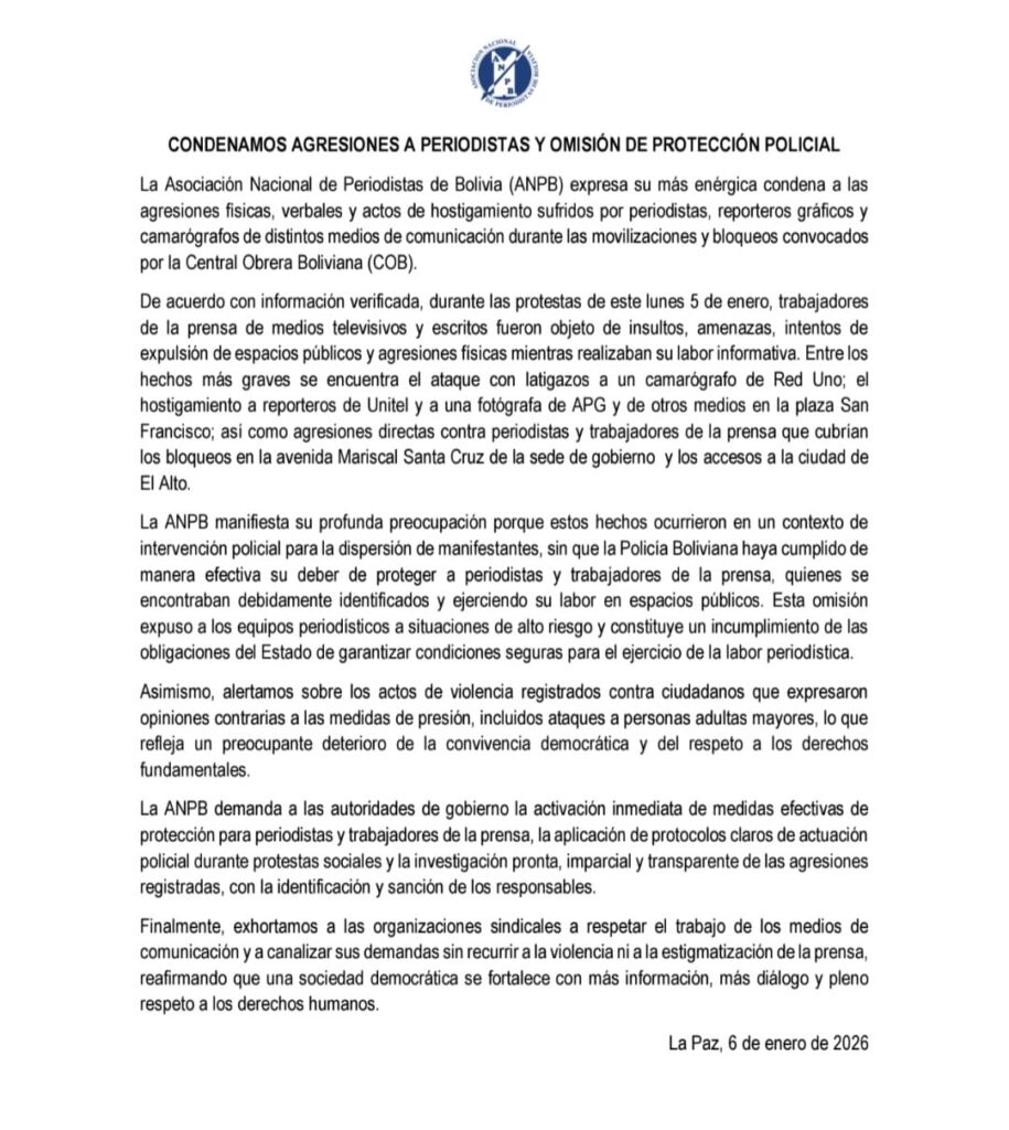 Según información verificada por la ANPB, durante las protestas del lunes 5 de enero, trabajadores de la prensa de distintos medios televisivos y escritos fueron insultados, amenazados y atacados físicamente mientras realizaban labores de cobertura en espacios públicos. Entre los hechos más graves se reportó el ataque con latigazos a un camarógrafo de Red Uno, además del hostigamiento a reporteros de Unitel y a una fotógrafa de la Agencia de Prensa Gráfica (APG) en inmediaciones de la plaza San Francisco, en la ciudad de La Paz.