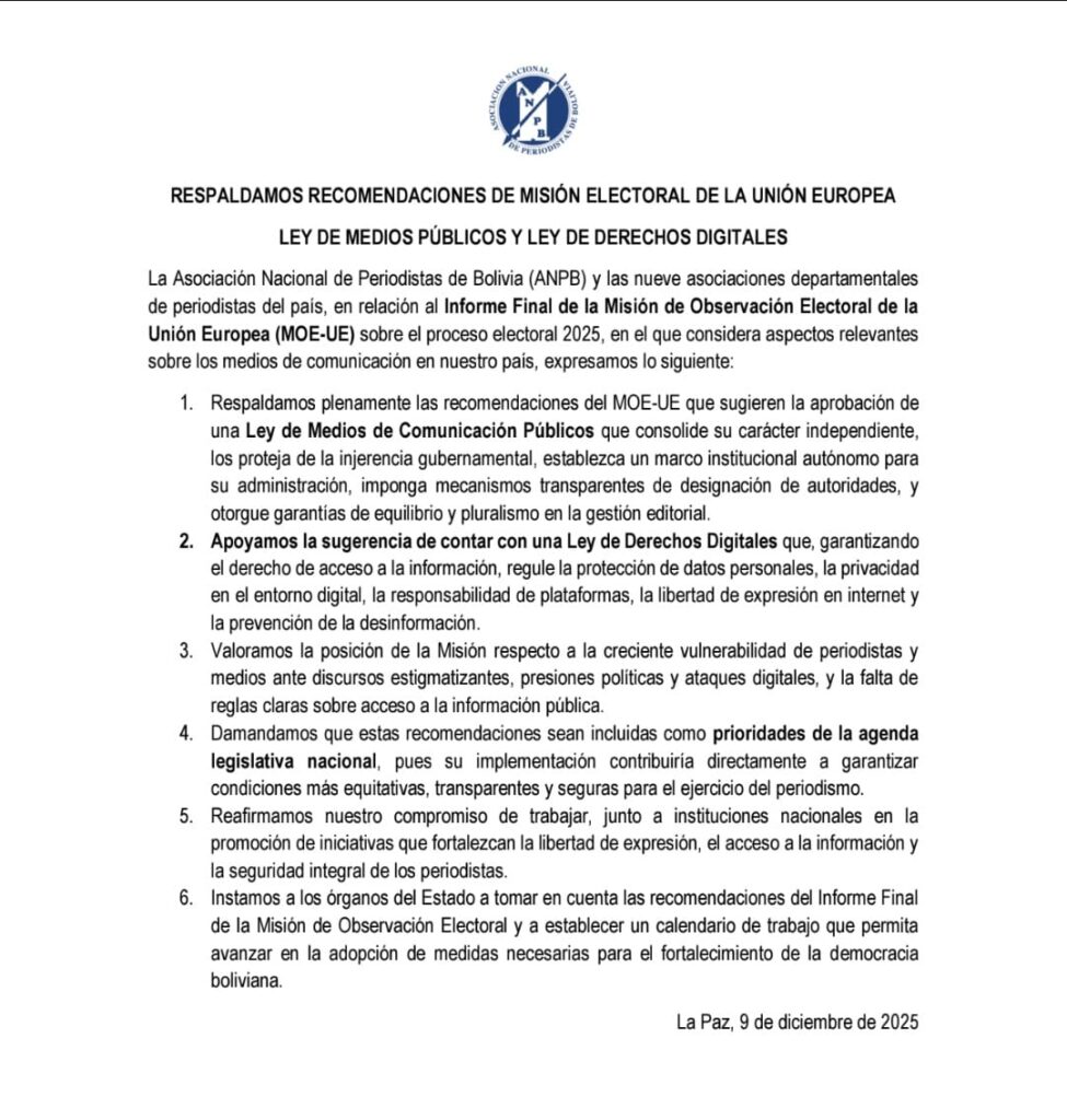 La Asociación Nacional de Periodistas de Bolivia (ANPB), junto con las nueve asociaciones departamentales de periodistas del país, manifestó su pleno respaldo a las recomendaciones emitidas por la Misión de Observación Electoral de la Unión Europea (MOE-UE), que sugiere la aprobación de una Ley de Medios de Comunicación Públicos y una Ley de Derechos Digitales en Bolivia.