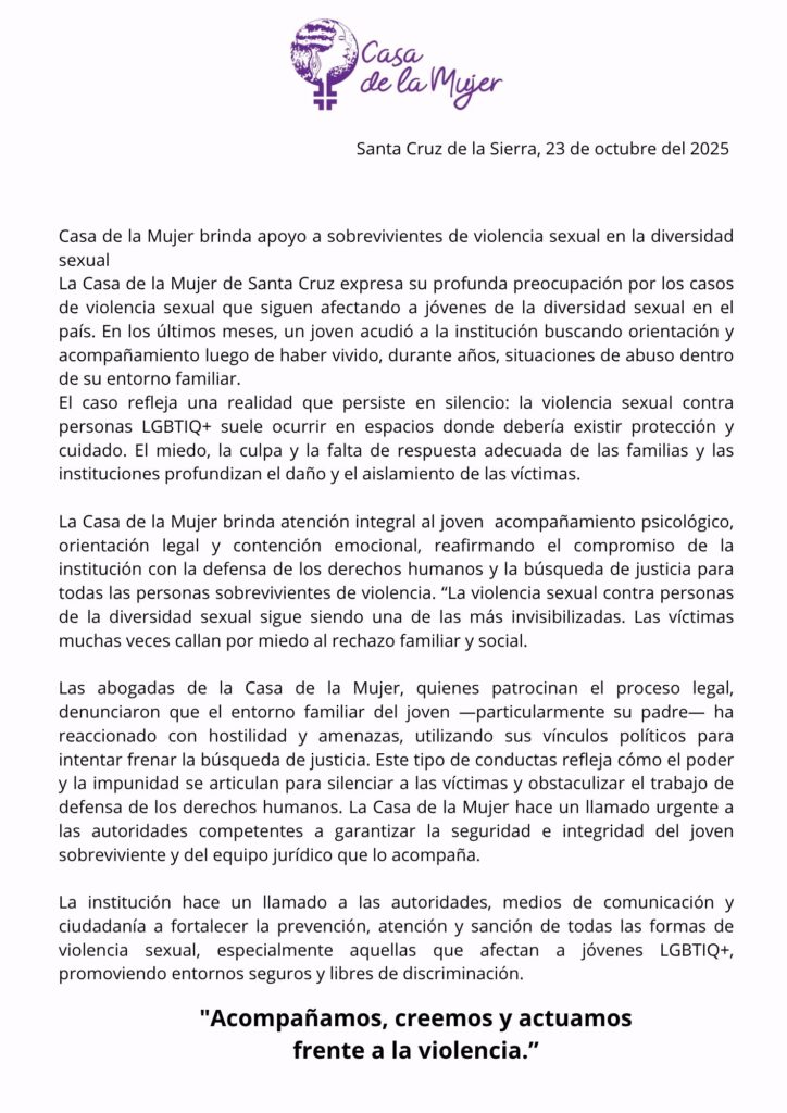 La Casa de la Mujer, que trabaja desde Santa Cruz, denunció este jueves que su equipo jurídico y una víctima de violencia están recibiendo amenazas de un ciudadano con vínculos políticos, debido a que la institución asumió la defensa de un joven de la comunidad LGBTIQ+, que vivió situaciones de abuso dentro de su entorno familiar.