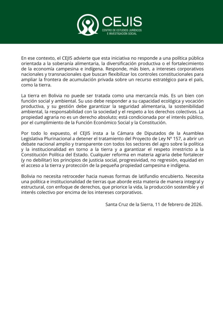 Por ello, el CEJIS instó a la Cámara de Diputados a detener el tratamiento del Proyecto de Ley Nº 157 y abrir un debate nacional amplio y transparente sobre la política de tierras, garantizando el respeto irrestricto a la Constitución y la protección de la pequeña propiedad campesina e indígena.