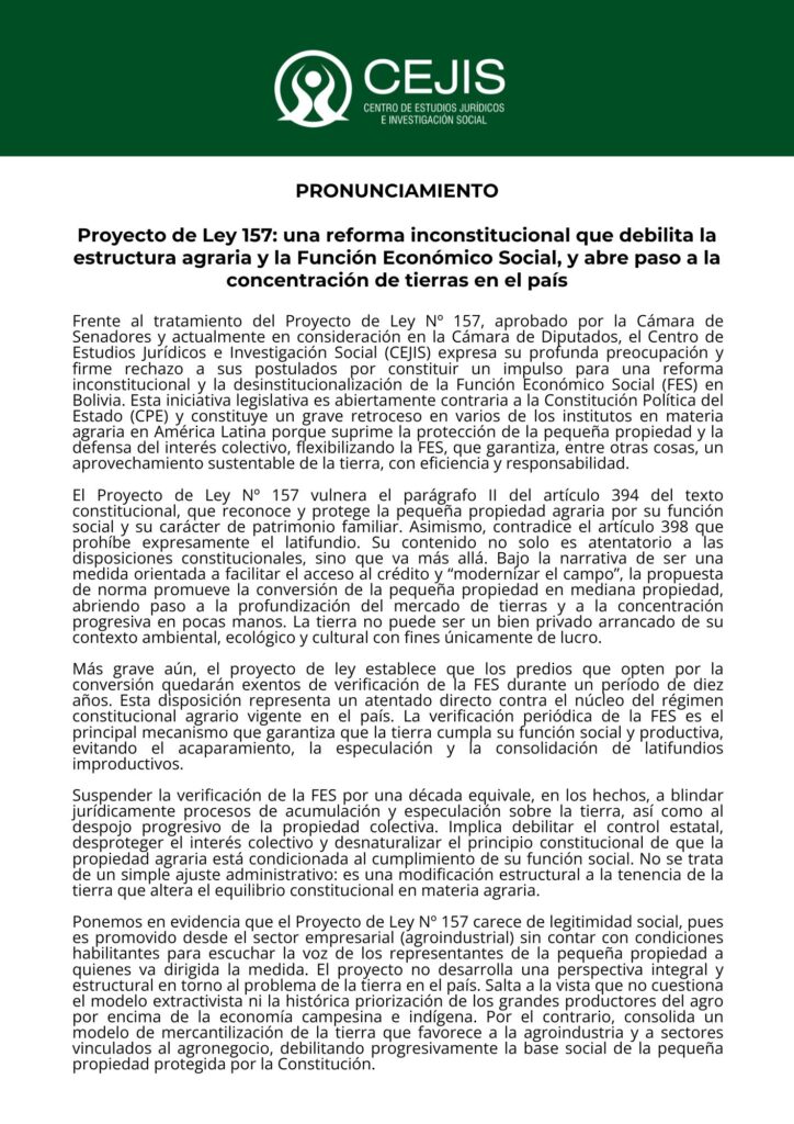El Centro de Estudios Jurídicos e Investigación Social (CEJIS) expresó su profunda preocupación y rechazo al Proyecto de Ley Nº 157, de transformación de la pequeña a mediana propiedad, actualmente en tratamiento en la Cámara de Diputados, tras haber sido aprobado en el Senado. La institución advierte que la iniciativa contradice disposiciones centrales de la Constitución Política del Estado (CPE) y abre paso a nuevas formas de concentración de la tierra en el país, como el latifundio.
