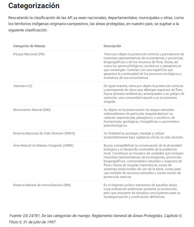 Respecto a la importancia de las áreas protegidas (AP), fue consultado Omar Osco, director general de Biodiversidad y Áreas Protegidas del Ministerio de Medio Ambiente y Aguas (MMAyA), quien describió al Sistema Nacional de Áreas Protegidas (SNAP) creado en 1992 a partir de la Ley 1333 del Medio Ambiente, el cual busca proteger y preservar especies amenazadas, vulnerables o en peligro de extinción, a tiempo de abarcar al conjunto de las AP en sus diferentes categorías de manejo.