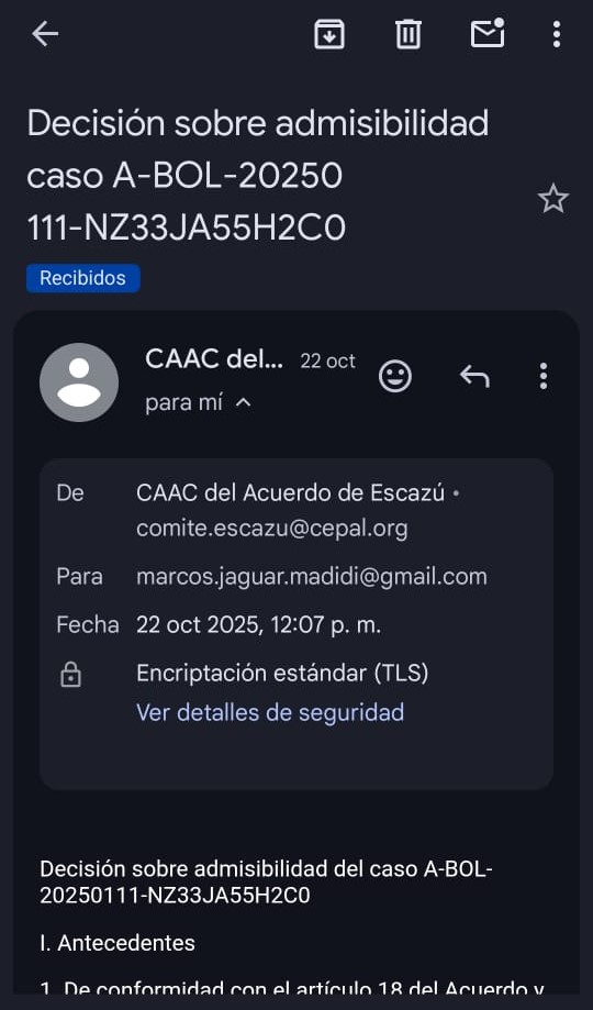 Uzquiano recibió la notificación de admisión mediante correo electrónico el 22 de octubre de este año. Y, explicó a Sumando Voces que el caso admitido bajo el código A-BOL-20250111-NZ33JA55H2C0 se refiere a las acciones emprendidas tras su destitución: “Envié una nota de comunicación al Comité de Seguimiento y Aplicación del Acuerdo Regional de Escazú”, precisó y sostuvo que este es un paso que abre la puerta para un análisis profundo de la situación de los defensores ambientales y fortalece los derechos de quienes trabajan por un mundo más justo y seguro.