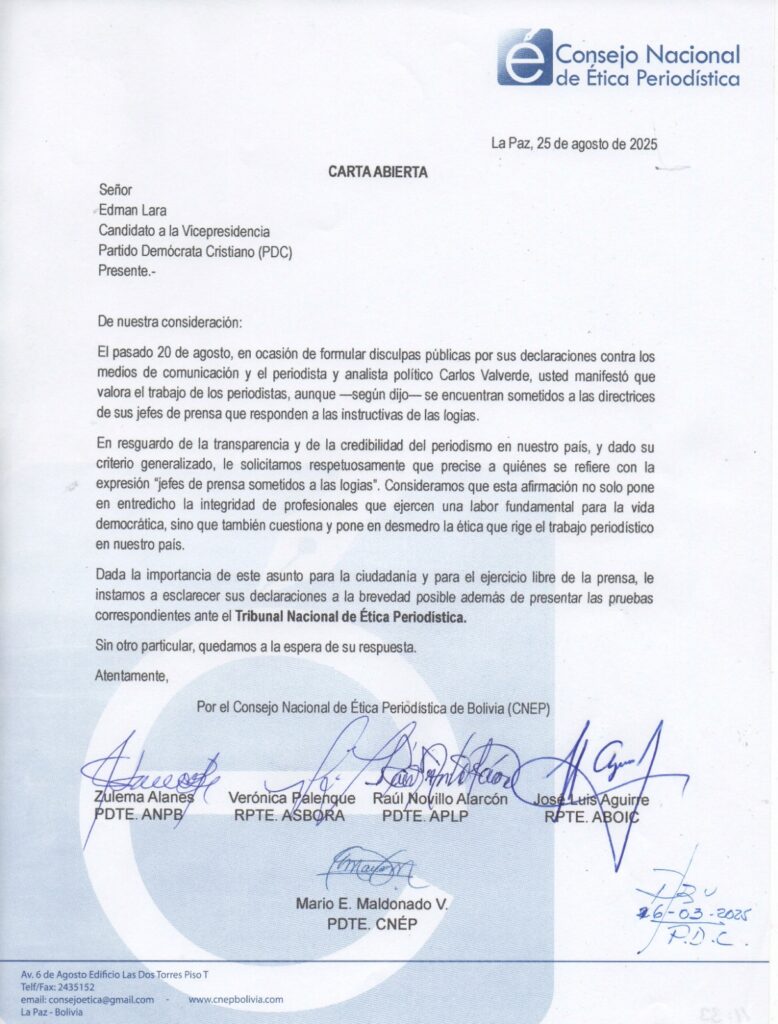 Mediante una carta pública, el Consejo Nacional de Ética Periodística (CNÉP) ha solicitado al candidato vicepresidencial del PDC, Edmand Lara, que aclare a quiénes se refiere cuando denuncia “jefes de prensa sometidos a las logias”, porque afecta la integridad del trabajo periodístico en Bolivia.