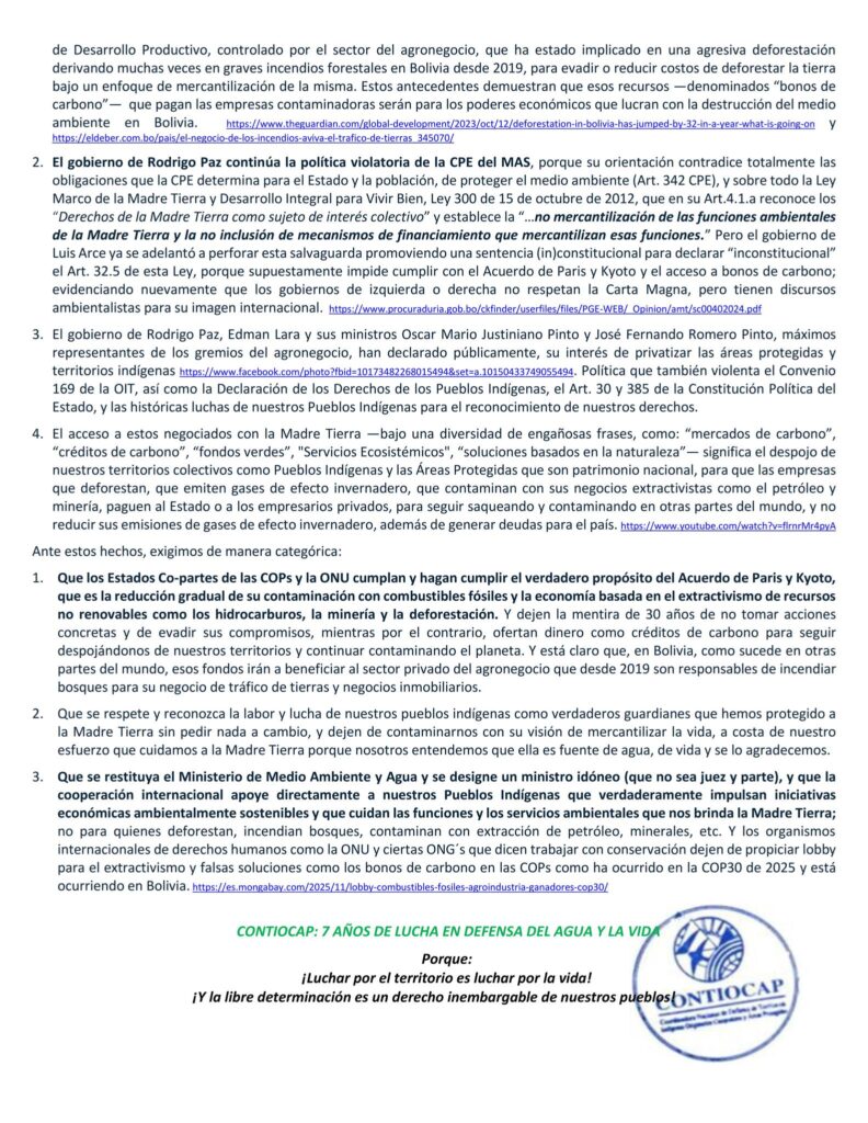 El comunicado asegura que, al igual que ocurrió durante el gobierno del Movimiento Al Socialismo (MAS), la actual administración continúa vulnerando la Constitución Política del Estado (CPE) y la Ley de la Madre Tierra, que prohíben expresamente la mercantilización de las funciones ambientales.
