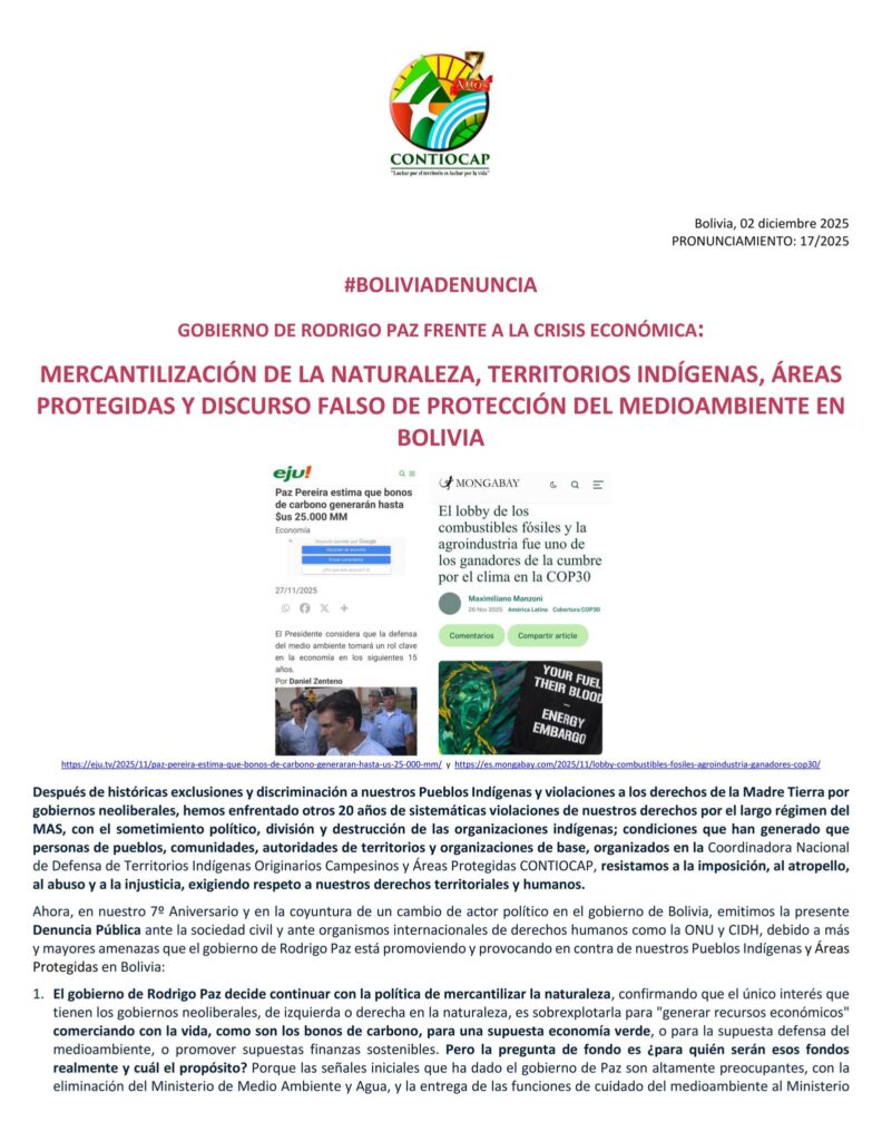 «Emitimos la presente denuncia pública ante la sociedad civil y ante organismos internacionales de derechos humanos como la ONU, CIDH, debido a más y mayores amenazas que el gobierno de Rodrigo Paz está promoviendo y provocando en contra de nuestros pueblos indígenas y áreas protegidas en Bolivia», señala la organización en un pronunciamiento público.