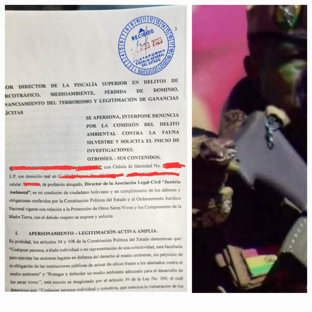 La mañana de este 12 de agosto activistas ambientales presentaron ante la Fiscalía Superior en Delitos Ambientales de la ciudad de Sucre una denuncia contra Hans Alberto Guerrero Valverde, Comandante de la Escuela de Cóndores del Ejército boliviano, y los efectivos militares que fueron hallados en tenencia y manejo ilegal del espécimen boa constrictor el pasado 7 de agosto en la ciudad de Sucre, según información publicada por la organización La Voz de la Naturaleza.