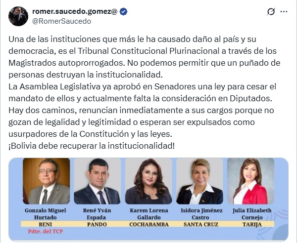 “Hay dos caminos: renuncian inmediatamente a sus cargos porque no gozan de legalidad ni legitimidad, o esperan ser expulsados como usurpadores de la Constitución y las leyes. ¡Bolivia debe recuperar la institucionalidad!”, escribió Saucedo en sus redes adjuntando la fotos de los cincos magistrados autoprorrogados: Gonzalo Hurtado, Yván Espada, Karem Gallardo, Isidora Jiménez y Julia Elizabeth Cornejo.