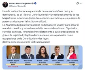 Este es el post de Romer Saucedo que dio origen … Sigue leyendo Crece la presión para que se vayan los autoprorrogados, pero advierten que es una estrategia contra las elecciones
