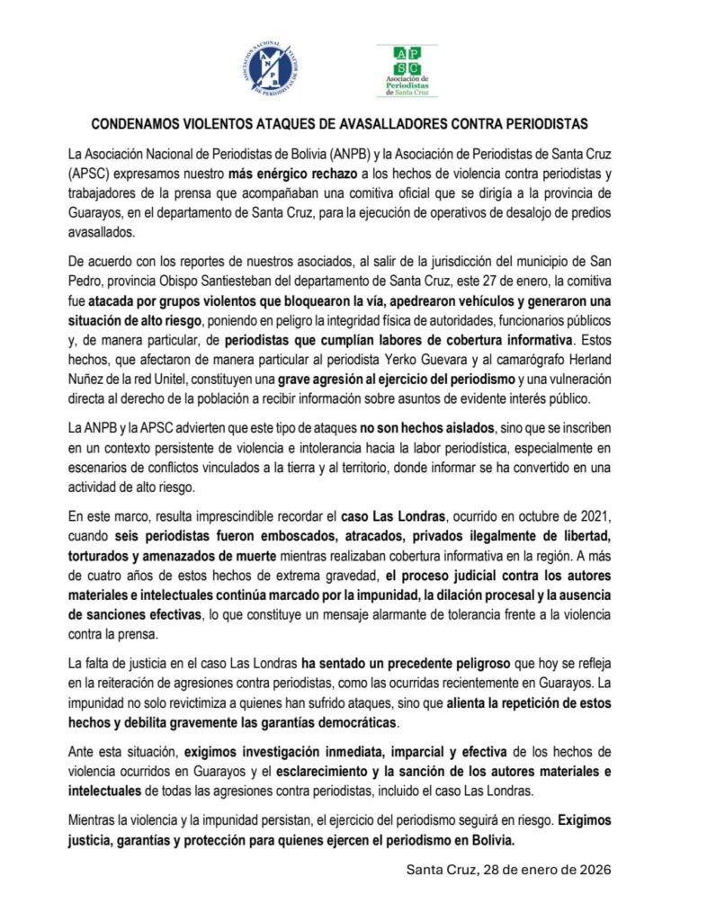 «Expresamos nuestro más enérgico rechazo a los hechos de violencia contra periodistas y trabajadores de la prensa que acompañaban una comitiva oficial que se dirigía a la provincia de Guarayos, en el departamento de Santa Cruz, para la ejecución de operativos de desalojo de predios avasallados», señala el documento.