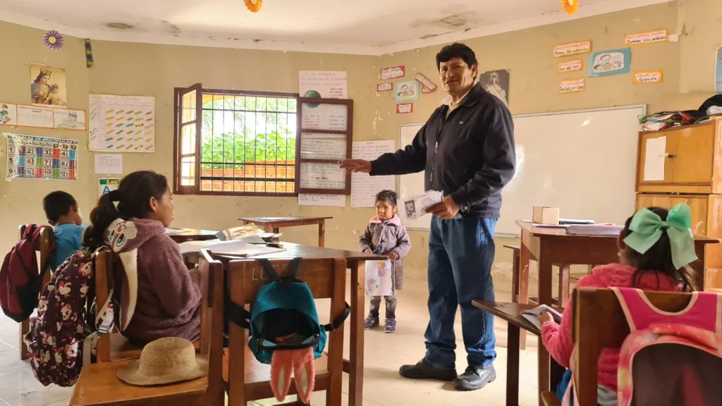 En un aula de seis estudiantes de distintas edades, en la comunidad de Carachimayo, un maestro de 54 años carga cada dos semanas, desde su casa —ubicada a un par de kilómetros de distancia—, un botellón con agua tratada. La lleva para que los niños la beban, pues en San Lorenzo, municipio del departamento de Tarija, el acceso a agua para consumo seguro es limitado.