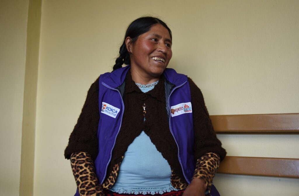 Maruja Copiracona porta el chaleco que identifica a las promotoras comunitarias. El Alto, Bolivia. Foto: Gustavo Ticona