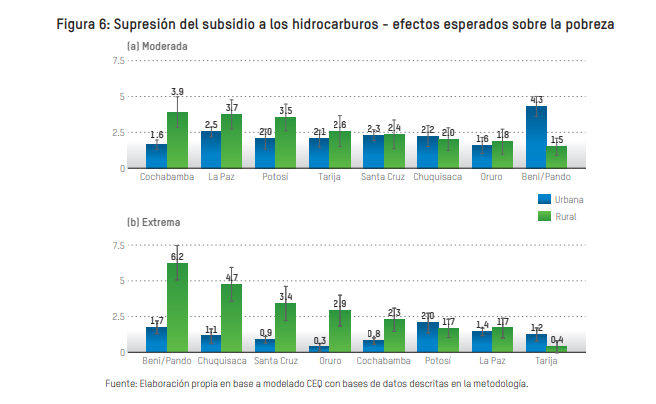 El estudio muestra que eliminar el subsidio a los combustibles aumentaría la pobreza moderada en 2,5 puntos porcentuales y la extrema en 1,5 puntos, mientras que la devaluación de la moneda elevaría estos índices en 10,8 y 4,7 puntos porcentuales. En ambos escenarios también se incrementa la desigualdad, siendo el efecto más pronunciado en el caso de la devaluación, por lo que es importante “implementar medidas sociales compensatorias que protejan a las poblaciones vulnerables”.