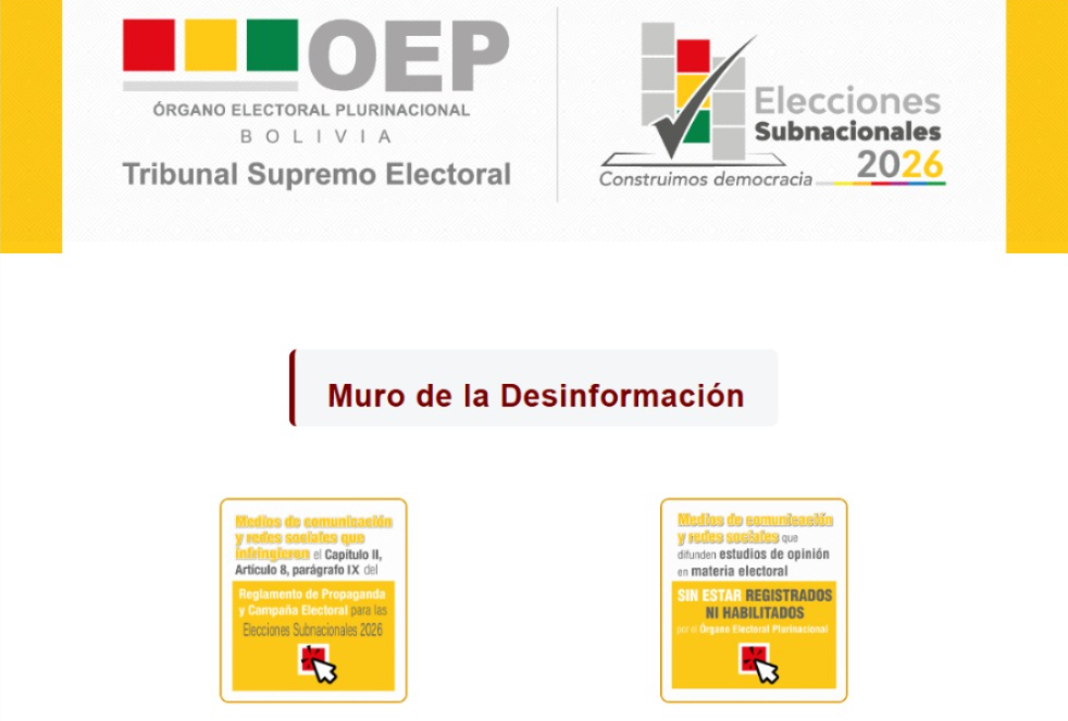 El Órgano Electoral Plurinacional (OEP) habilitó en su portal web el denominado Muro de la Desinformación, con dos secciones donde expone públicamente contenidos que generan y amplifican desinformación y que infringen la normativa electoral vigente para las Elecciones Subnacionales 2026.