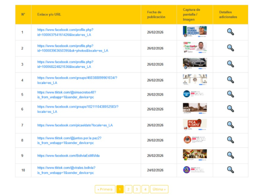 Accediendo al sitio mediante este link se pueden observar dos recuadros en los cuales se identifican los “Medios de comunicación y redes sociales que infringieron el capítulo II, artículo 8, parágrafo IX del Reglamento de Propaganda y Campaña Electoral” y los “Medios de comunicación y redes sociales que difunden estudios de opinión en materia electoral sin estar registrados ni habilitados por el Órgano Electoral Plurinacional”