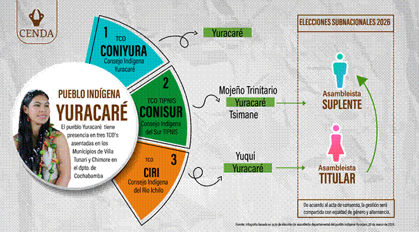 En una reunión ampliada realizada el 2 de marzo de 2026, con la participación de caciques mayores y autoridades comunales, se suscribió un acta de consenso que fue formalizada en el acto de elección del 20 de marzo con la supervisión del Servicio Intercultural de Fortalecimiento Democrático FIDE-Cbba. Acto democratico que consolida la unidad orgánica del pueblo Yuracaré que emana resultado de este proceso colectivo, y en aplicación del principio de rotación considerando que en la gestión 2021–2026 la titularidad fue ejercida por el Consejo CONISUR y la suplencia por el CIRI, para el periodo 2026–2031 se definió que el Consejo CIRI asuma la titularidad y el Consejo CONIYURA la suplencia. En ese marco, se designó a Damaris Orihuela (CIRI) como asambleísta departamental titular y a Mario Guzmán (CONIYURA) como asambleísta suplente.