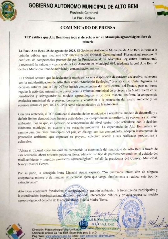 La sentencia fue emitida el 3 de junio de este año, pero fue comunicada recientemente. Por tanto, el alcalde, Beltrán Márquez, y la presidenta del Concejo de Alto Beni, Nancy Chambi, emitieron un comunicado celebrando la decisión.