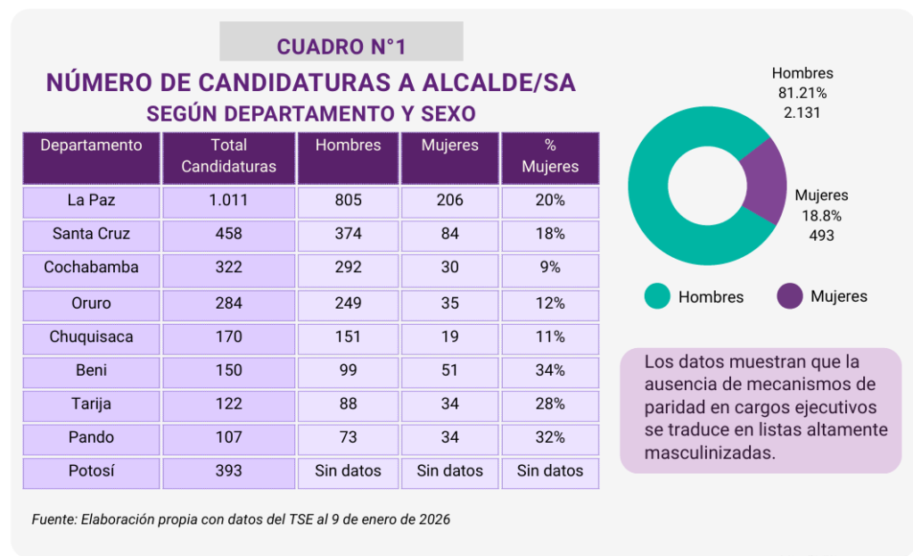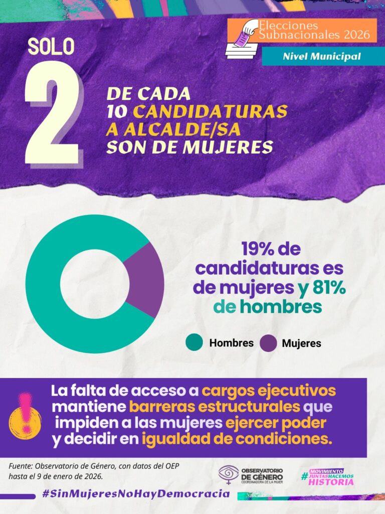 A menos de dos meses de las Elecciones Subnacionales 2026, un análisis del Observatorio de Género de la Coordinadora de la Mujer revela que solo dos de cada 10 candidaturas a las alcaldías corresponden a mujeres. Lo que evidencia la persistencia de una enorme brecha entre la paridad formal y el acceso real de las mujeres a la actividad y al poder político en Bolivia