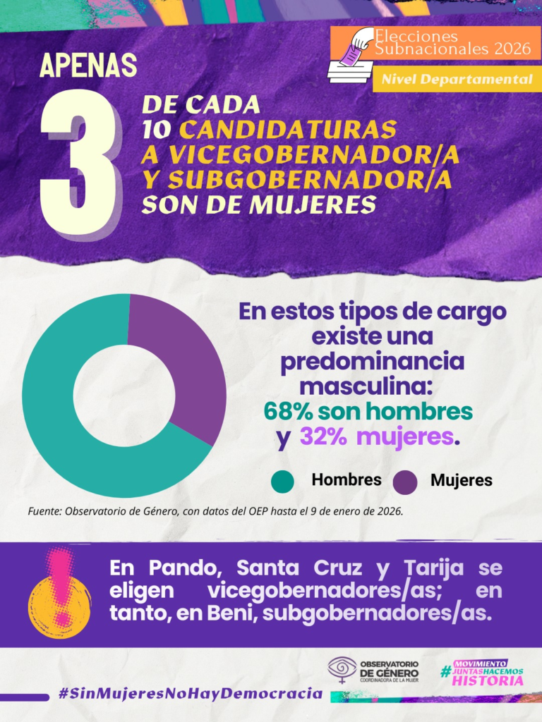 La exclusión es aún más notoria en el nivel departamental. En las candidaturas a gobernador o gobernadora, las mujeres representan solo el 12% del total, con 11 postulaciones frente a 83 de hombres. En departamentos como Santa Cruz, Chuquisaca y Tarija no se registró ninguna candidatura femenina para este cargo, mientras que en La Paz su presencia es marginal.