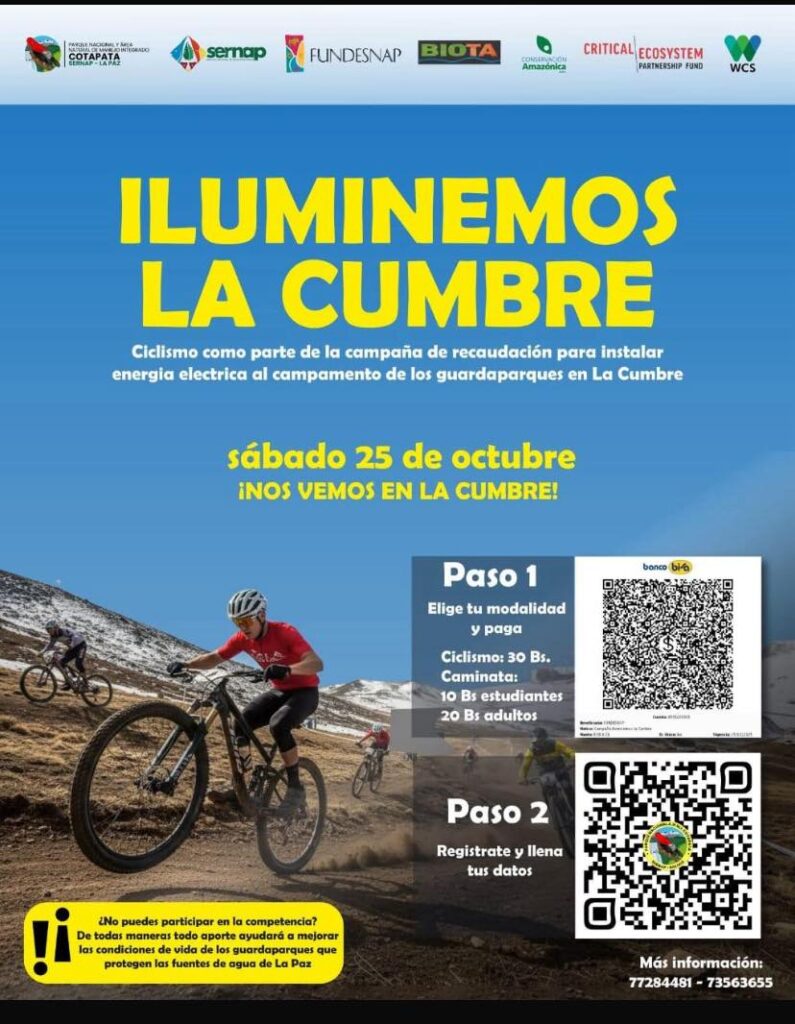 Los guardaparques del Parque Nacional Cotapata, en La Paz, lanzaron la campaña “Iluminemos la Cumbre” con el objetivo de recaudar más de 100.000 bolivianos para llevar electricidad a uno de sus refugios, ubicado a más de 4.000 metros sobre el nivel del mar, en la cumbre paceña. En ese sentido, el sábado 25 octubre desarrollarán carreras ciclísticas y caminatas interpretativas para que la población pueda participar.