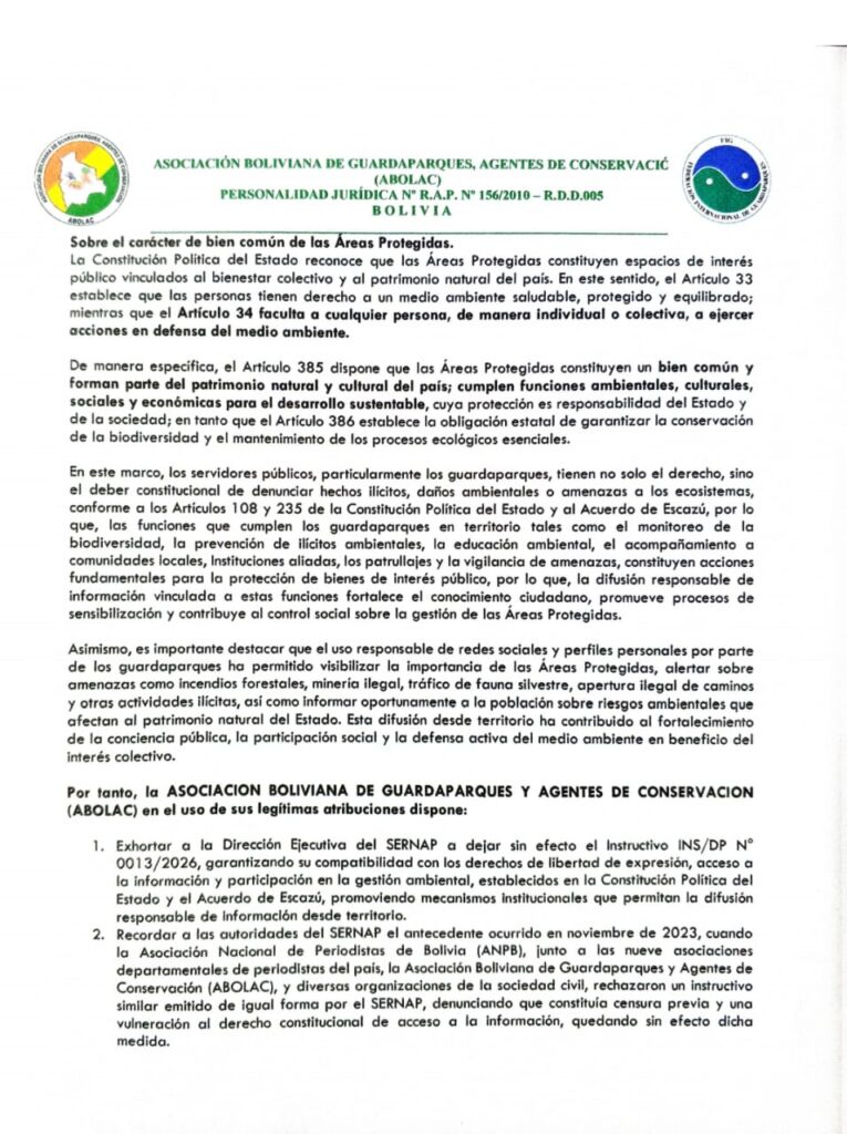 La Asociación Boliviana de Guardaparques y Agentes de Conservación (Abolac) expresó su “profunda preocupación” y rechazo al Instructivo INS/DP N° 0013/2026 emitido por la Dirección Ejecutiva del Servicio Nacional de Áreas Protegidas (Sernap), al considerar que restringe el uso de cuentas personales en redes sociales para difundir información sobre la gestión en áreas protegidas y podría vulnerar derechos constitucionales.