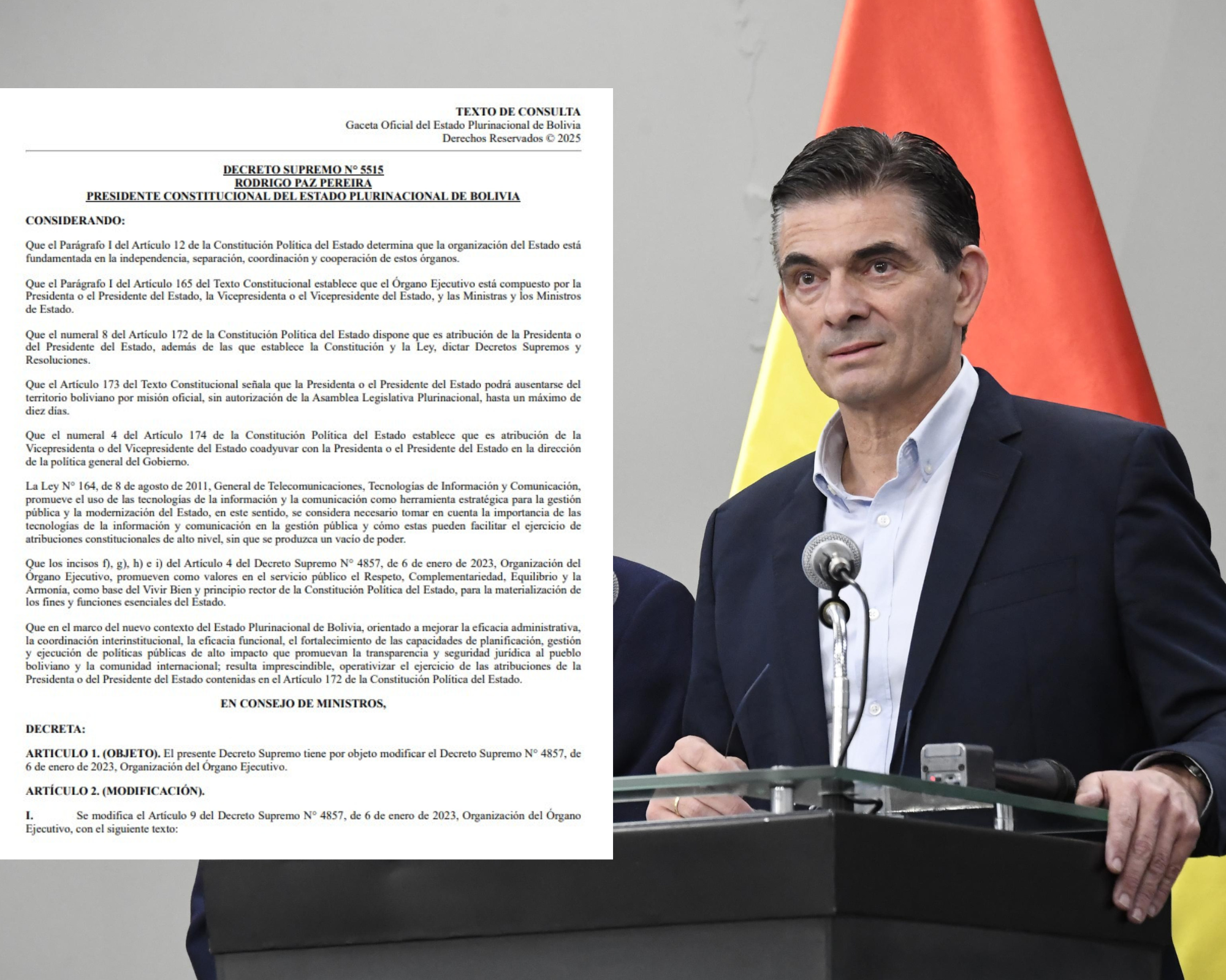 En medio de las tensiones entre Rodrigo Paz y Edmand Lara, esta semana, la Sala Constitucional Tercera del Tribunal de Justicia de La Paz rechazó la acción popular que buscaba frenar el Decreto Supremo 5515. En consecuencia, la norma sigue vigente y el presidente puede ejercer funciones desde el exterior, por medios virtuales. Dos constitucionalistas coinciden en que la ausencia temporal del mandatario no implica abandonar sus labores, más si en una eventual salida del territorio boliviano sigue en funciones de Estado. En su análisis, alertan que designar al vicepresidente como reemplazo generaría una “figura anómala” de “doble presidencia”.