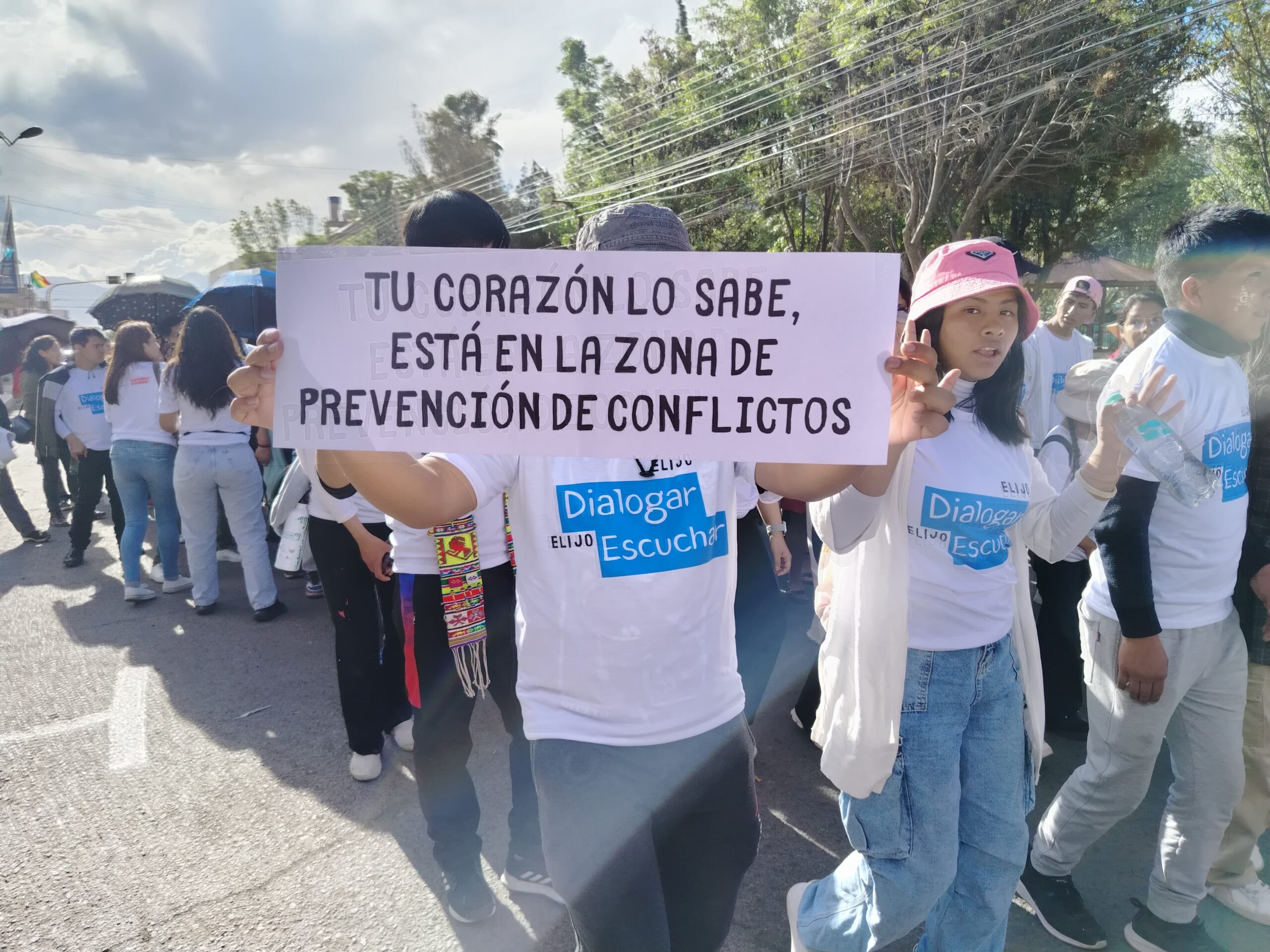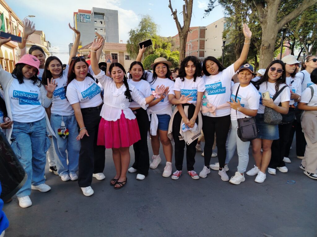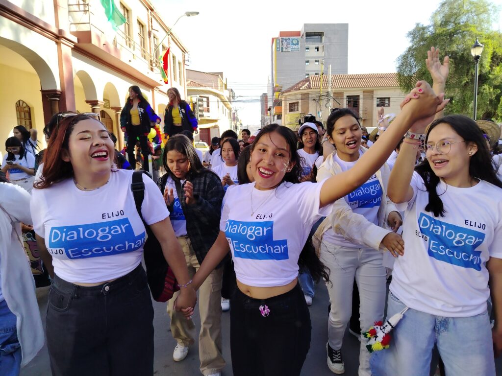 Más de 150 comunicadores y jóvenes de 43 municipios del país, integrantes de la Red Nacional por la Cultura de Paz, llevaron a cabo en Sacaba, Cochabamba, una intervención artístico-comunicacional bajo el lema “Elijo dialogar/Elijo escuchar”, con el objetivo de promover la convivencia pacífica y prevenir conflictos a través del arte y la comunicación.