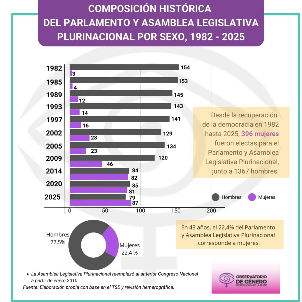 Por primera vez desde el retorno de la democracia, la Asamblea Legislativa estará integrada por más mujeres que hombres, señala una nota de prensa de la Coordinadora de la Mujer, que califica el hecho como “un avance significativo en la participación política de las mujeres en Bolivia”.