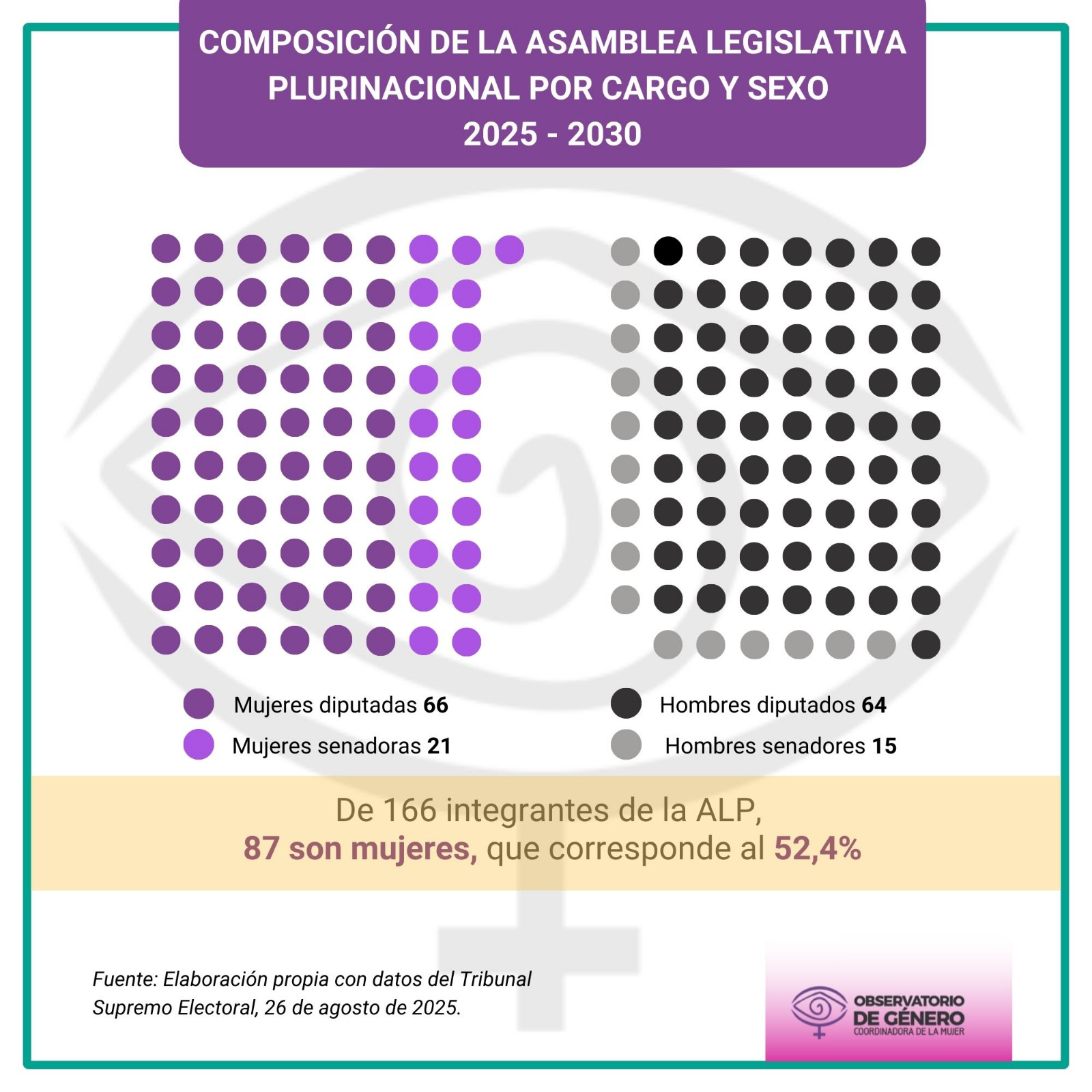 Por primera vez desde el retorno de la democracia, la Asamblea Legislativa estará integrada por más mujeres que hombres, señala una nota de prensa de la Coordinadora de la Mujer, que califica el hecho como “un avance significativo en la participación política de las mujeres en Bolivia”.