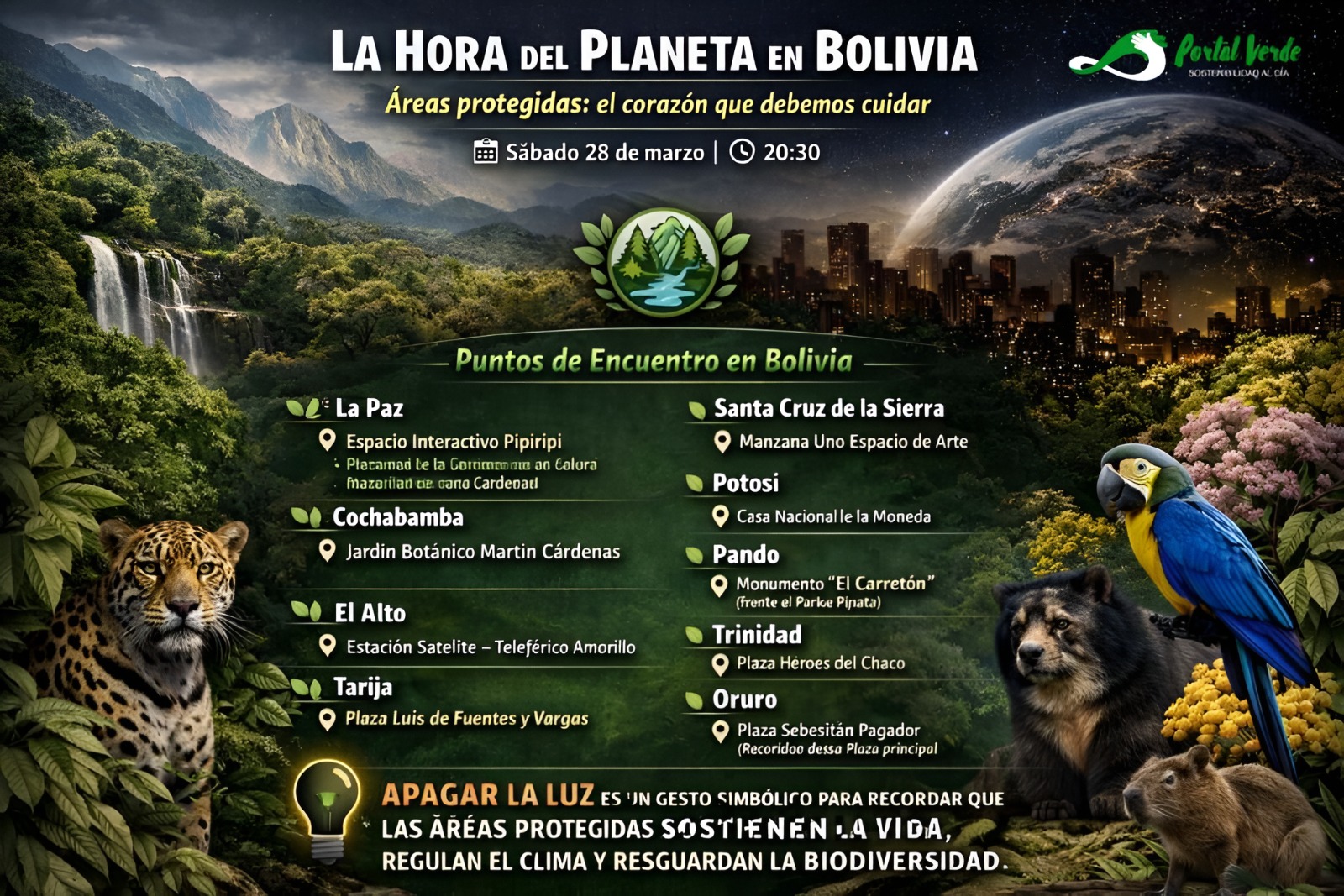 Este sábado 28 de marzo Bolivia se sumará a la Hora del Planeta, iniciativa global liderada por el Fondo Mundial para la Naturaleza (WWF), que convoca a la población a apagar las luces y desconectar los aparatos eléctricos durante una hora como símbolo de compromiso con el cuidado del medio ambiente.