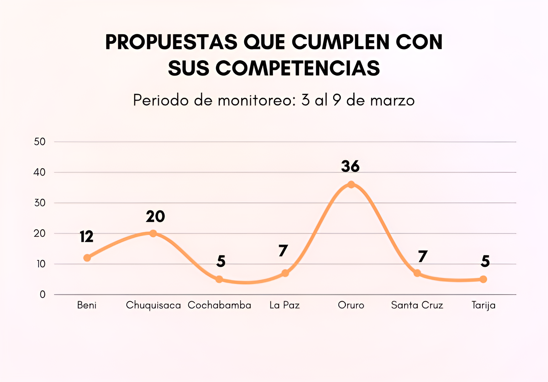 En Oruro y Tarija se observa una proporción relativamente alta de propuestas alineadas con las competencias de gobernaciones y alcaldías, lo que muestra una mayor correspondencia entre la oferta electoral y las atribuciones de las autoridades subnacionales.