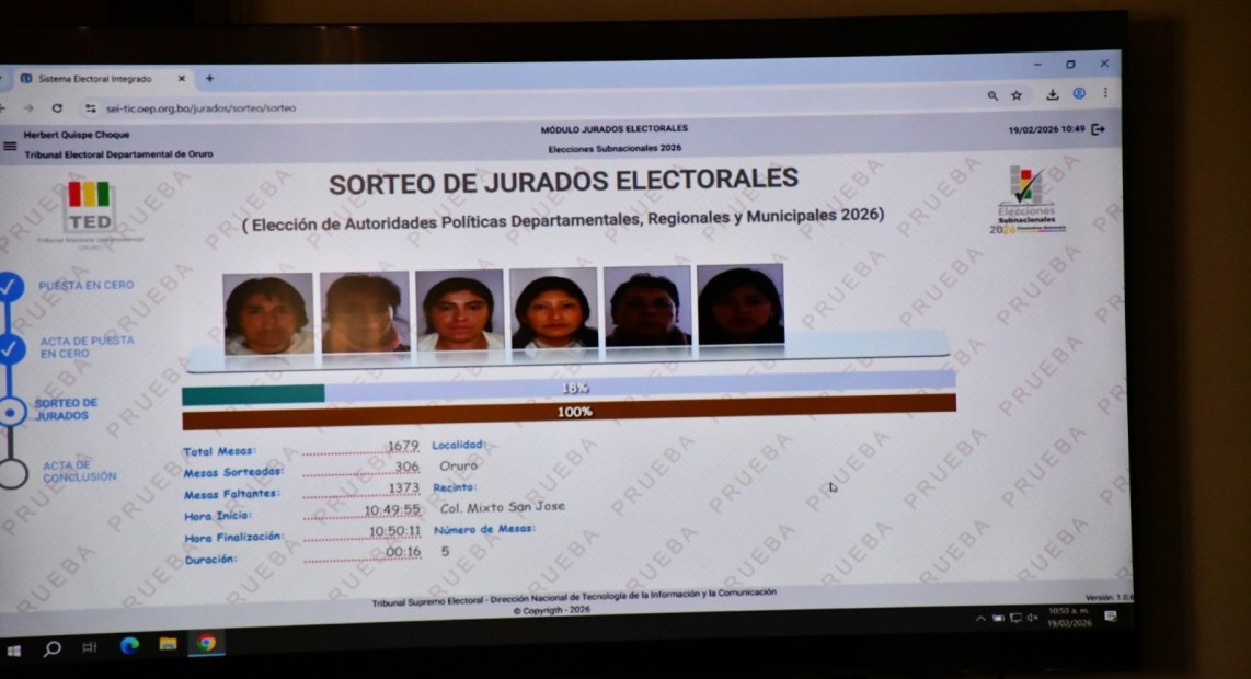 Además, informó que la notificación oficial a las personas seleccionadas se realizará entre el 21 de febrero y el 22 de marzo, mientras que la nómina completa será publicada el domingo 22 de febrero en medios de prensa escrita y en el portal institucional del Órgano Electoral Plurinacional, en la sección Yo Participo.