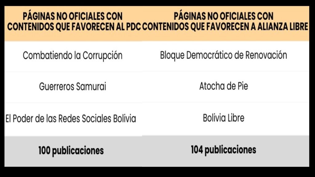 El monitoreo, realizado entre el 22 al 28 de septiembre, identificó que de 204 publicaciones, 104 fueron a favor de la Alianza Libre y 100 inclinadas al Partido Demócrata Cristiano (PDC). “La mayoría de los contenidos tuvo un tono negativo”.