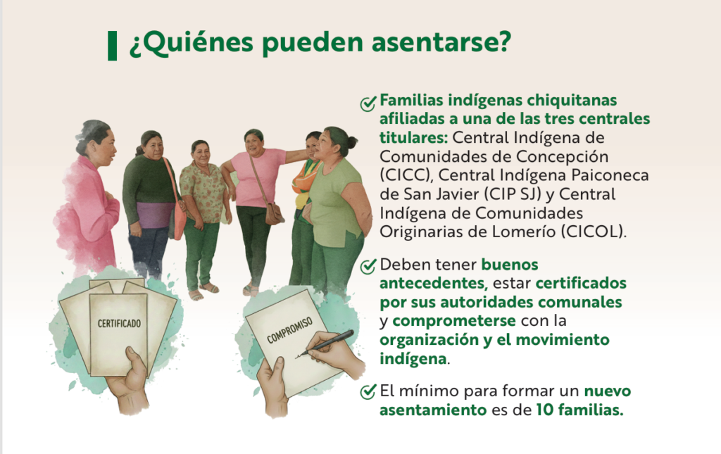 El documento define que solo pueden asentarse familias indígenas chiquitanas afiliadas a una de las tres centrales titulares del territorio —la Central Indígena de Comunidades de Concepción (CICC), la Central Indígena Paiconeka de San Javier (CIP-SJ) y la Central Indígena de Comunidades Originarias de Lomerío (CICOL)— y fija como mínimo la conformación de diez familias para la creación de una nueva comunidad.
