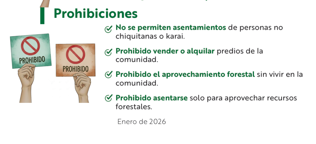 Finalmente, el protocolo establece prohibiciones expresas, como el asentamiento de personas no chiquitanas o karai, la venta o alquiler de predios comunales y el aprovechamiento forestal sin residencia efectiva en la comunidad. Estas restricciones buscan evitar la mercantilización del territorio y el uso especulativo de los recursos naturales.