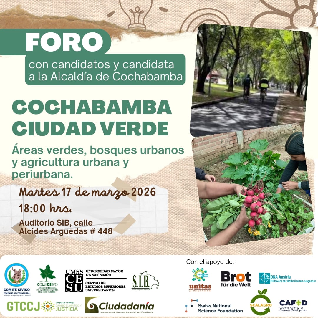 Organizaciones de la sociedad civil y la academia convocan al foro “Cochabamba Ciudad Verde”, un espacio de diálogo donde candidatas y candidatos a la Alcaldía de Cochabamba presentarán sus propuestas sobre áreas verdes, bosques urbanos y agricultura urbana y periurbana.