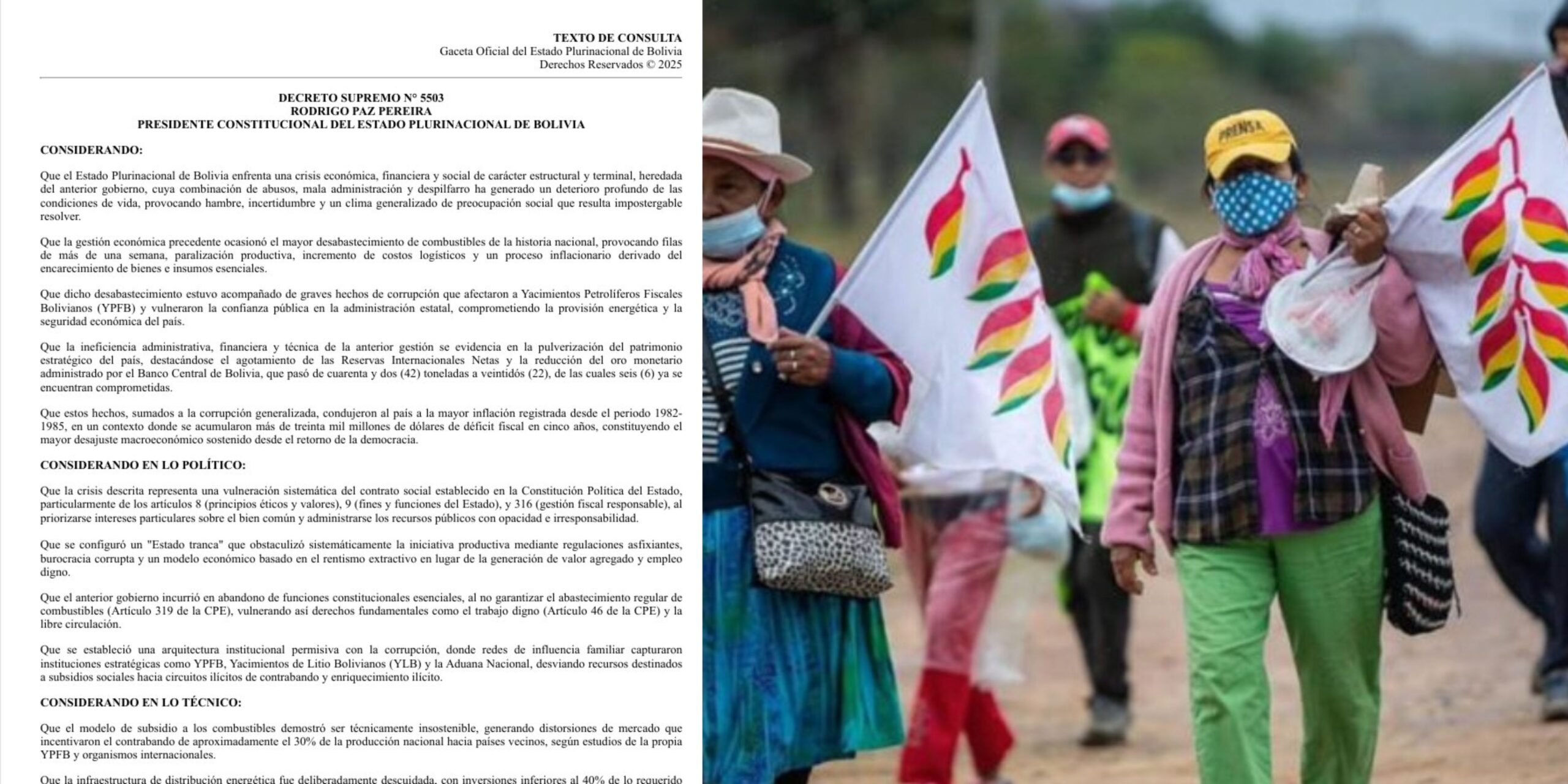 «Para nosotros este DS 5503 significa pérdida de soberanía territorial y sobre nuestros recursos naturales, pero sobre todo para nosotros los pueblos indígenas significa el despojo territorial, pérdida de medios de vida fundamentales como el agua y la invasión a las áreas protegidas para siempre, porque no habrá ningún límite para las inversiones extractivistas, con la mayor destrucción de bosques y ecosistemas, e incluso la mercantilización de los territorios, abriéndolos al mercado de bonos de carbono», refirió la Contiocap en su pronunciamiento.