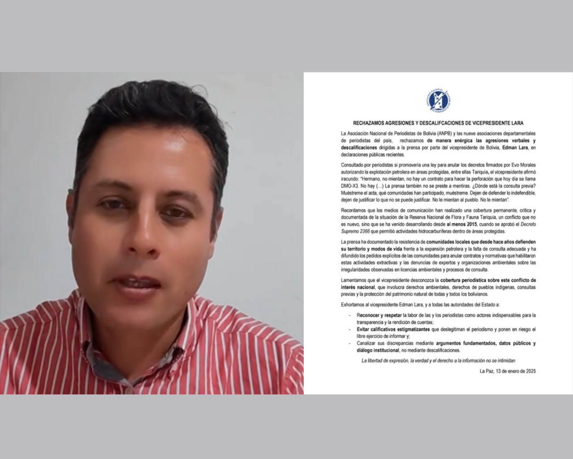 La Asociación Nacional de Periodistas de Bolivia (ANPB), junto a las nueve asociaciones departamentales del país, expresó su rechazo enérgico a las agresiones verbales y descalificaciones emitidas por el vicepresidente Edman Lara contra la prensa, durante recientes declaraciones públicas vinculadas al conflicto en la Reserva Nacional de Flora y Fauna Tariquía.