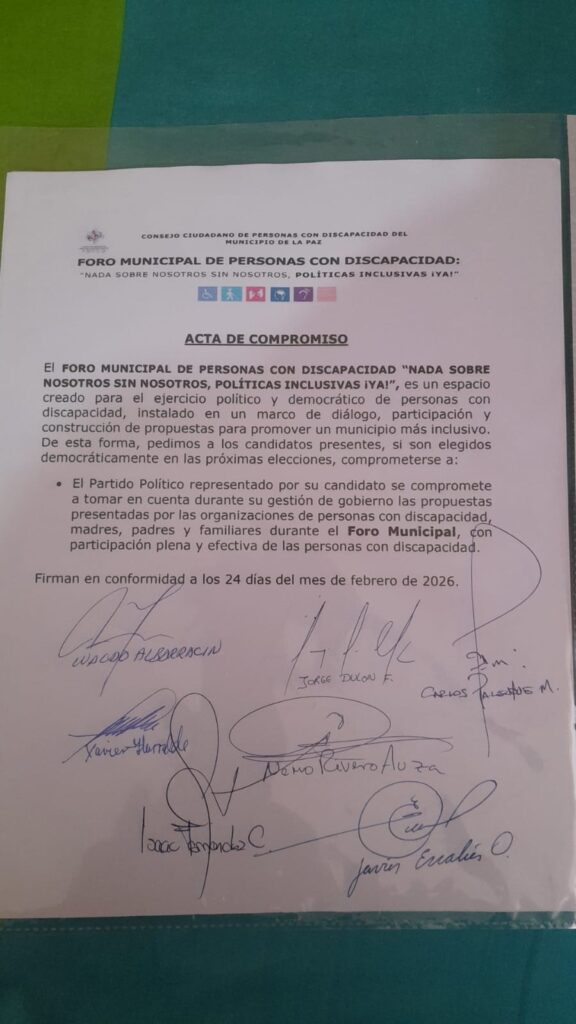 En un foro público marcado por la participación activa de personas con discapacidad, padres, madres y tutores, el Consejo Ciudadano de Personas con Discapacidad del municipio de La Paz presentó su propuesta municipal a ocho candidaturas a la Alcaldía, exigiendo compromisos concretos en inclusión en salud, educación, empleo y accesibilidad urbana.