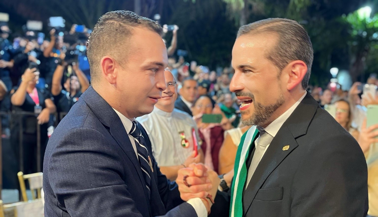 Romer Saucedo y Luis Fernando Camacho se encontraron en la sesión de honor de los 171 años de Montero el fin de semana. Foto: El Deber