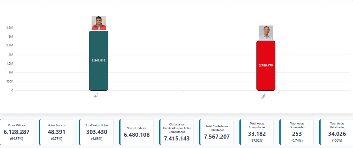Las actas computadas llegaron al 97,7%, los votos nulos fueron del 4,69%, los blancos, 0,75%.
