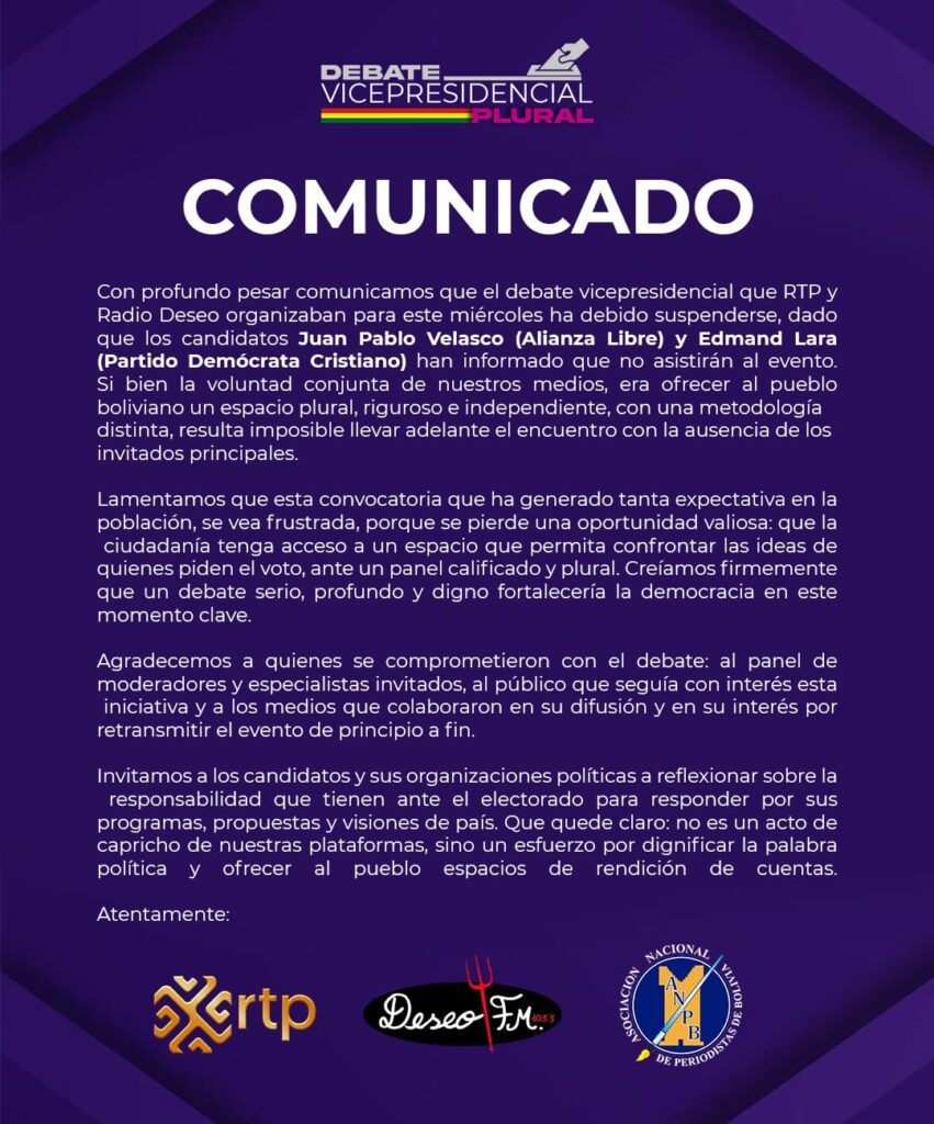 El canal RTP, la radio Deseo y la Asociación de Periodistas han anunciado este miércoles la decisión de suspender el debate alternativo, después de que los candidatos vicepresidenciales Juan Pablo Velasco y Edmand Lara informaron que no asistirán al evento.