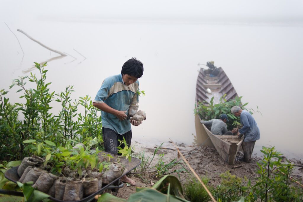 Marco Lero, hermano de Julio, ayuda a cargar plantines en un bote a las orillas de Torewa Campesina.