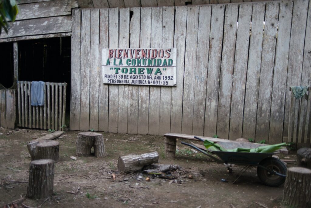 Por eso, Ocampo se jacta de un letrero que tiene en el muro de su casa, la primera cuando uno ingresa al poblado desde el río Beni.  “Bienvenidos a la Comunidad Torewa, fundada el 30 de agosto de 1992, con personería jurídica N° 001/1995”. Dice que él y otros a quienes convenció para venirse hasta acá se instalaron con carpas de lona. Se les metieron los gusanos bajo la piel, contrajeron leishmaniasis, comieron la abundante carne de pescado y chancho tropero que la selva les ofrecía. Los perros se hicieron el manjar de los jaguares, y los jaguares las víctimas de los humanos.