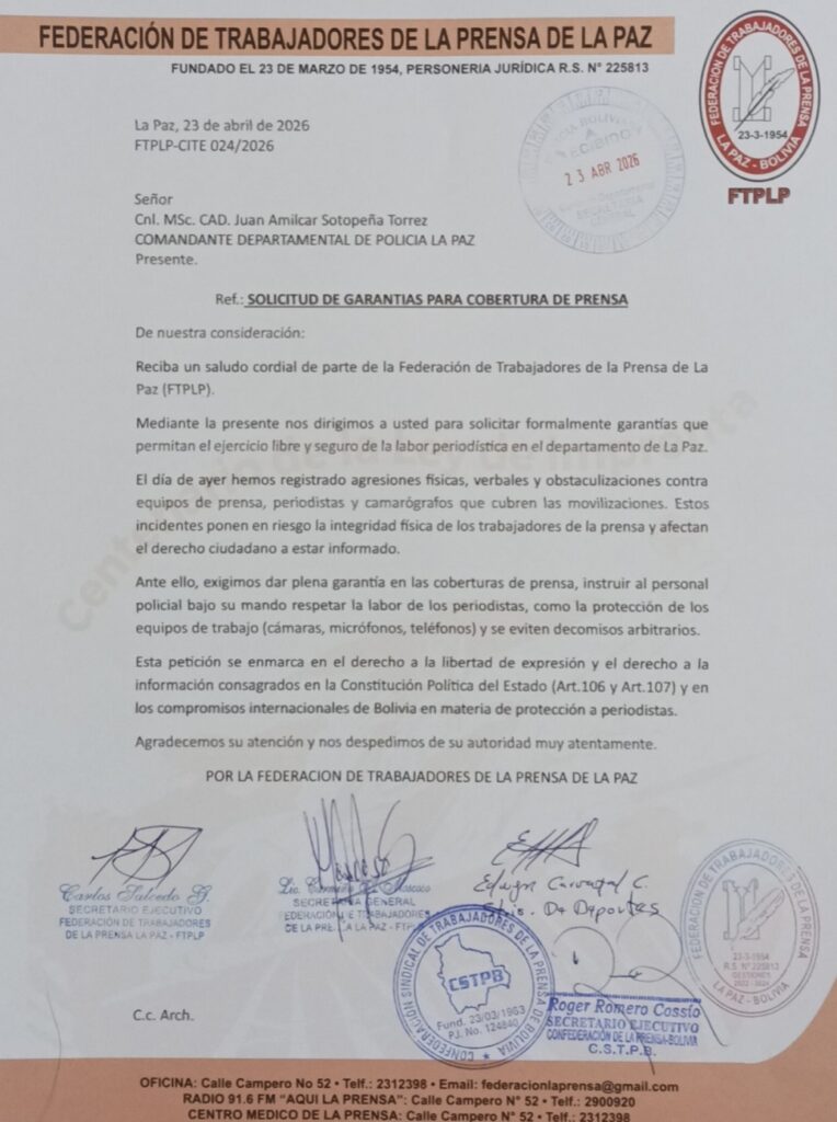 En vista de los hechos, este jueves, la Federación de Trabajadores de la Prensa de La Paz y la Confederación de Trabajadores de la Prensa de Bolivia enviaron una carta al comandante Departamental de la Policía de La Paz, Juan Amilcar Sotopeña, para reclamar por lo sucedido y exigir las garantías correspondientes.