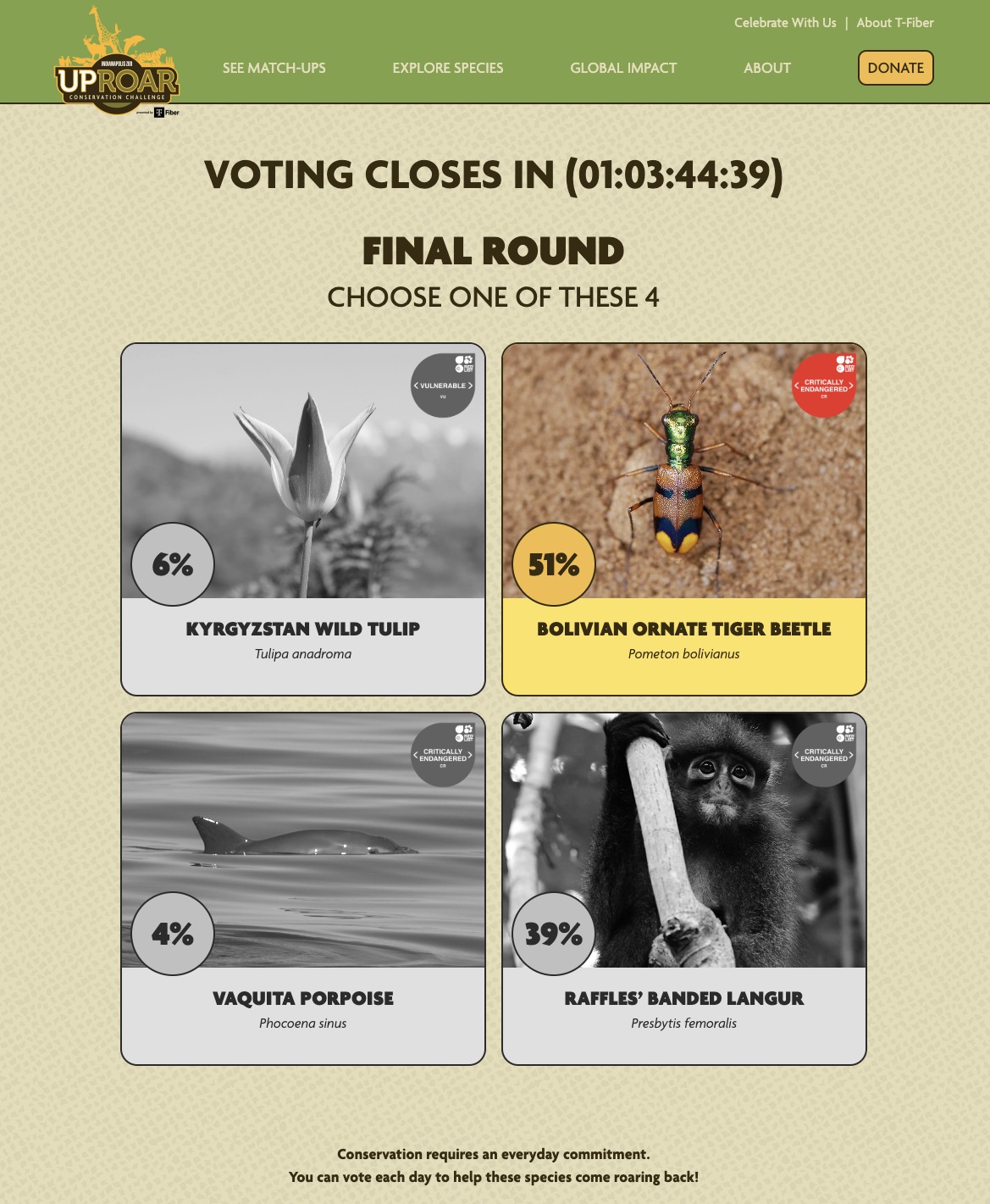 Los cuatro competidores que llegaron a la final son el tulipán silvestre de Kirguistán, el marsopa vaquita, el langur rayado de Raffles y el escarabajo tigre. Este último lleva la delantera con una votación del 51% en comparación a los otros animales.