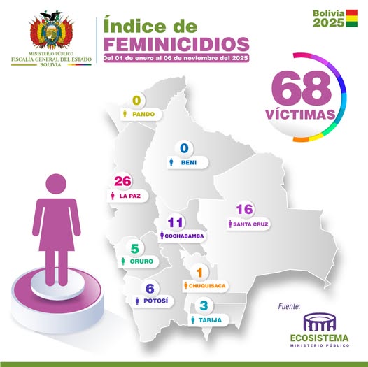 De acuerdo con datos oficiales de la Fiscalía General del Estado, del 1 de enero al 6 de noviembre de 2025, se registraron 68 víctimas de feminicidio: 26 en La Paz, 16 en Santa Cruz, 11 en Cochabamba, seis en Potosí, cinco en Oruro, tres en Tarija y uno en Chuquisaca.