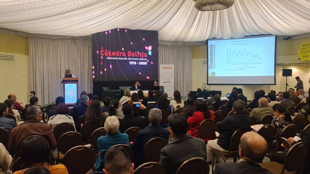 El acto comenzó con el desarrollo de la primera sesión de la Cátedra Bolivia 1976–2050, un espacio abierto, gratuito e itinerante que busca promover la reflexión sobre la democracia, los derechos humanos y el desarrollo sustentable, articulando la memoria histórica con los desafíos del futuro.