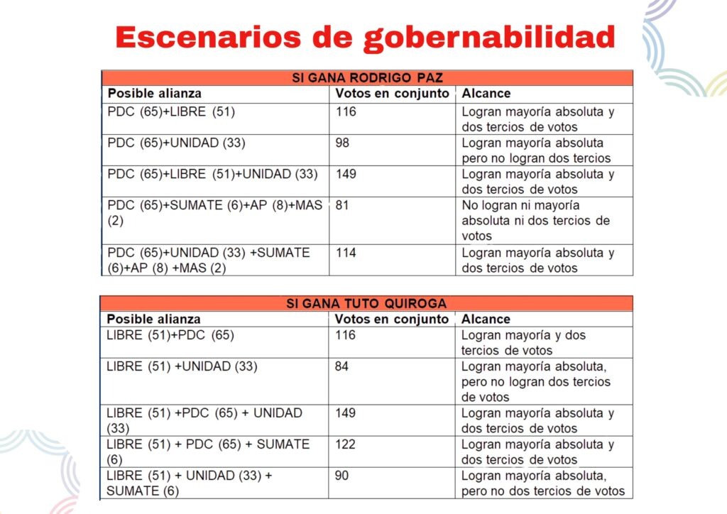 Durante el programa se mostró un cuadro con los escenarios de gobernabilidad en los que se puede observar que entre Libre, PDC y Unidad suman 149 legisladores, logrando no solo mayoría absoluta, sino dos tercios de votos. La otra combinación que logra dos tercios de votos es Libre con PDC, los dos partidos que van a la segunda vuelta y que suman 116 votos.